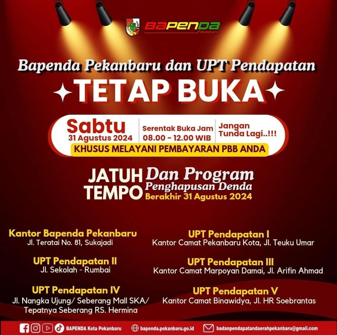 Selaim itu, akhir pembayaran PBB-P2 dan Program Penghapusan Denda akan berakhir pada 31 Agustus 2024 dan berharap seluruh masayarakat menunaikan kewajiban yang bersifat tahunan ini, jika belum melunasinya. Akur berharap masyarakat dapat memaksimalkan keberadaan posko bayar serentak yang akan dioperasikan Bapenda Pekanbaru pada Sabtu (31/08/2024) .