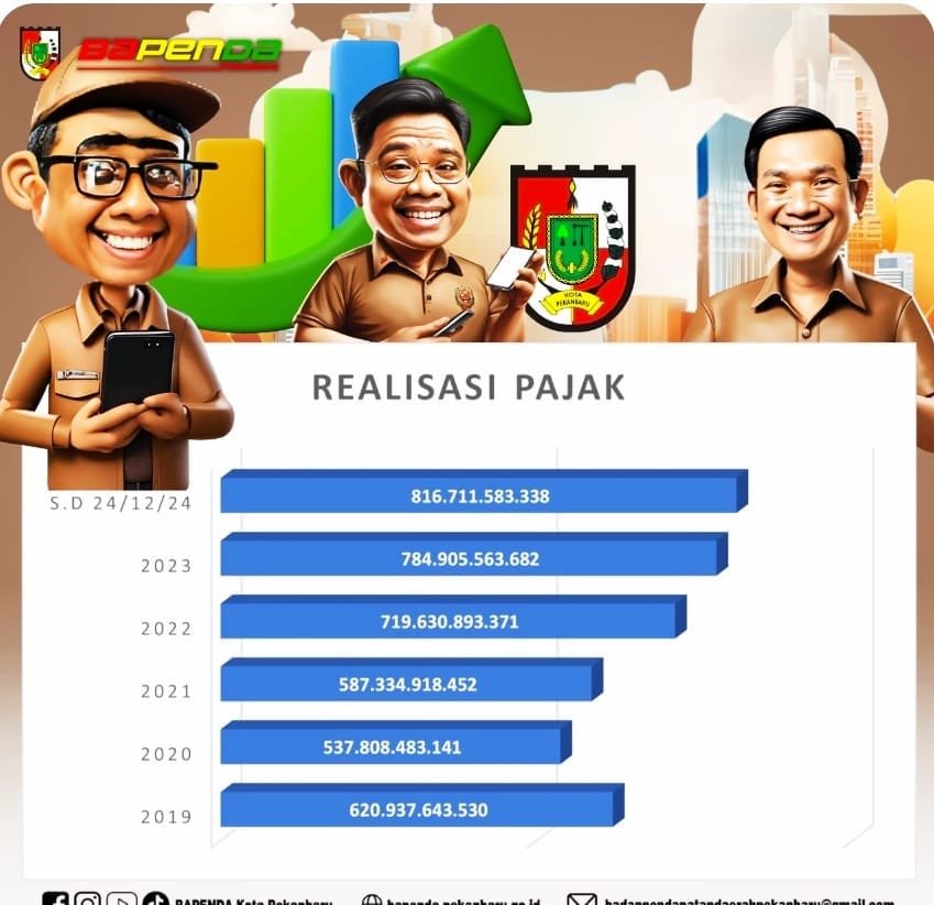 Semenjak dipercaya menjadi Kabapenda Pekanbaru terhitung mulai tahun pajak 2022, gairah pertumbuhan pajak daerah terus melihatkan angka-angka yang optimis. Tercatat pada tahun buku 2021 realisasi kinerja pajak daerah baru menyentuh angka 587 milyar (masih terpengaruh kondisi pandemic) dan 1 tahun menjelang covid pada 2019 realisasinya juga baru menyentuh pada angka 620 milyar.