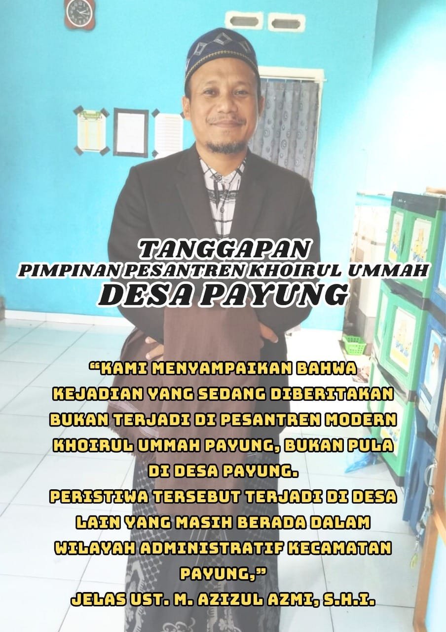 “Kami menyampaikan bahwa kejadian yang sedang diberitakan bukan terjadi di Pesantren Modern Khoirul Ummah Payung, bukan pula di Desa Payung. Peristiwa tersebut terjadi di desa lain yang masih berada dalam wilayah administratif Kecamatan Payung,” jelas Ust. M. Azizul Azmi, S.H.I.