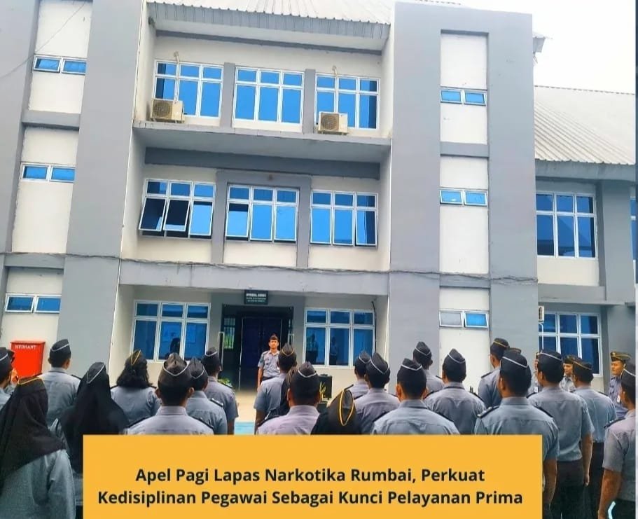 60BERITA.ID | Pekanbaru – Lembaga Pemasyarakatan (Lapas) Narkotika Kelas IIB Rumbai awali hari pertama tugas dalam minggu ini dengan melaksanakan apel pagi dengan penuh khidmat. Apel pagi rutin merupakan media bagi pimpinan untuk memberikan instruksi, apresiasi hingga evaluasi tugas dan fungsi sebagai Petugas Pemasyarakatan dan wejangan diluar tugas dan fungsi sebagai Aparatur Sipil Negara (ASN).