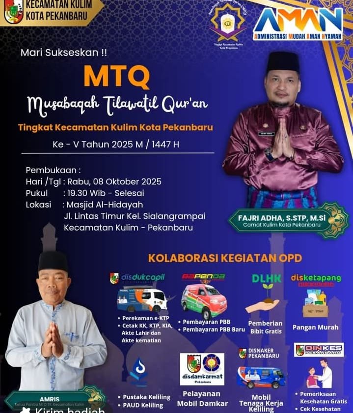 60BERITA.ID | Pekanbaru – Musabaqah Tilawatil Quran(MTQ) tingkat kecamatan sudah mulai digelar di 12 kecamatan yang ada di kota Pekanbaru setelah MTQ tingkat kelurahan rampung dilaksanakan, Demikian halnya dengan kecamatan paling bungsu di Pekanbaru yakni kecamatan Kulim yang akan menggelar MTQ tingkat kecamatan pada hari Rabu 08 Oktober 2025 dan akan diadakan dimasjid paripurna Al-Hidayah Jalan lintas timur kelurahan Sialang Rampai.