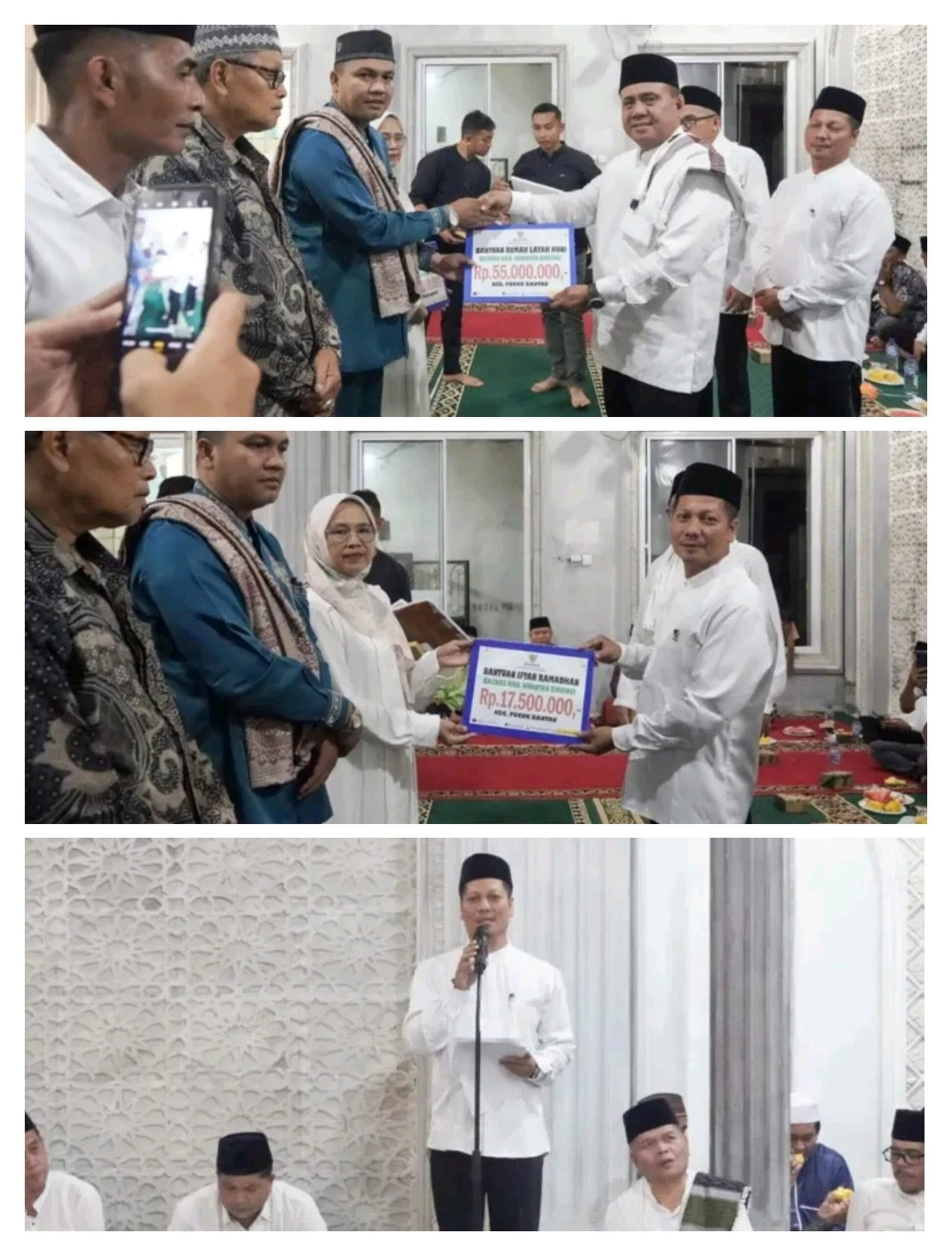 Pada kesempatan tersebut, Wabup Muklisin juga menyerahkan berbagai bantuan kepada masyarakat sebagai bentuk kepedulian pemerintah daerah bersama Baznas Kuansing. Bantuan tersebut meliputi satu unit rumah layak huni dari Baznas Kuansing senilai Rp55 juta, bantuan untuk kaum jompo kepada 30 orang senilai Rp18,9 juta, bantuan iftar Ramadhan sebanyak 50 paket senilai Rp17,5 juta, bantuan bagi penyandang disabilitas kepada tiga orang senilai Rp1,5 juta, serta bantuan untuk anak yatim sebesar Rp2 juta dari Masjid Agung Ar-Raudhah Kuantan Singingi.(adv)