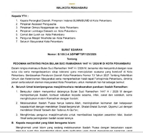 Edaran ini mengatur terkait sejumlah aktivitas masyarakat agar menciptakan situasi kondusif selama Bulan Suci Ramadan. Surat edaran tersebut ditandatangani langsung oleh Wali Kota (Wako) Pekanbaru, Agung Nugroho, Selasa 17 Februari 2026.